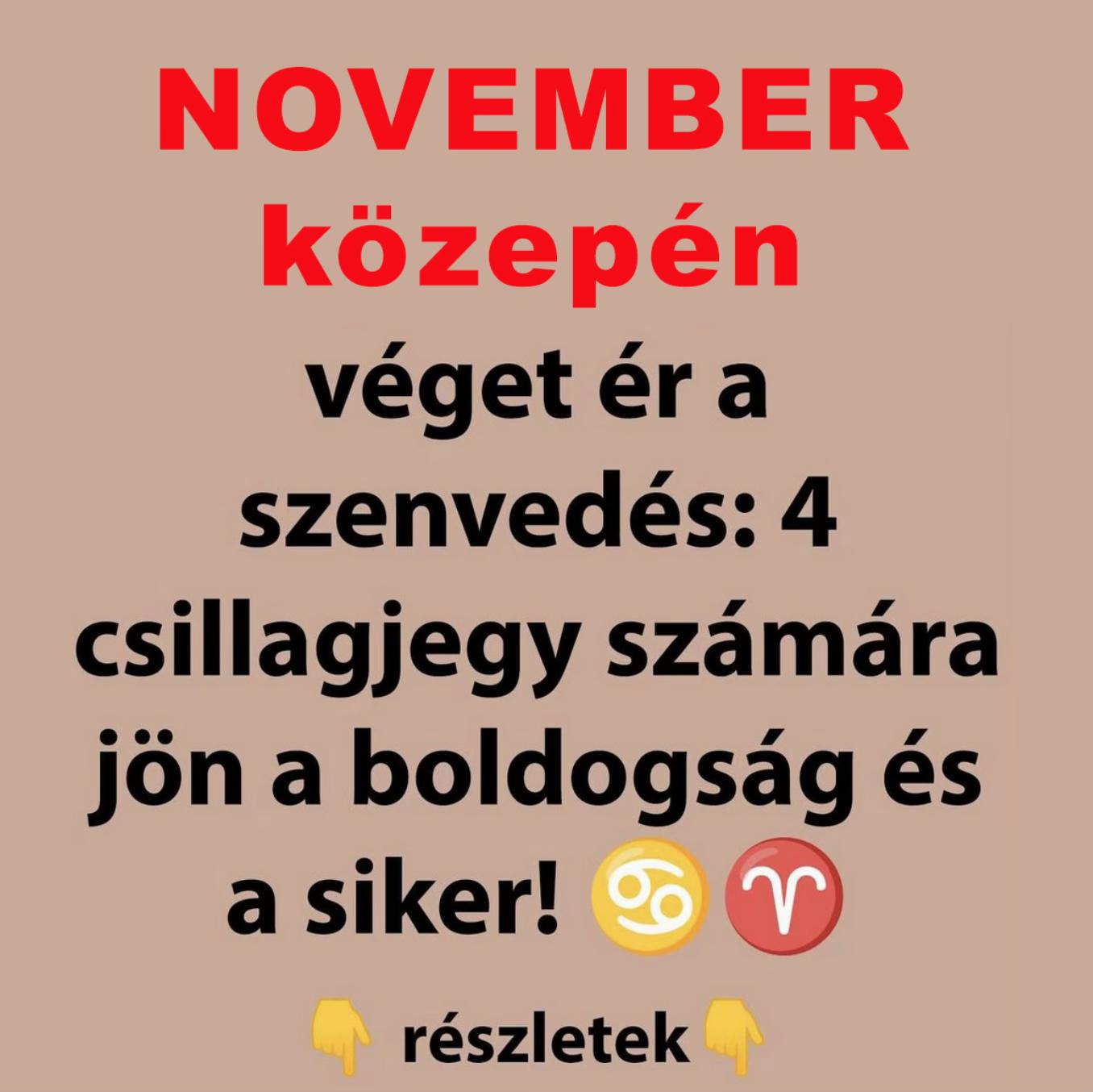 Rák (06.22.–07.22.)A szenvedés véget ér, Rák, és a november közepe új fényt hoz az életedbe. Végre leteszed a múlt terheit, és megérted, miért kellett ennyi próbát kiállnod. A szeretteid most különösen közel állnak hozzád, és segítenek, hogy újra mosolyogj. Pénzügyi helyzeted stabilizálódik, és valamilyen váratlan jó hír is érkezhet, ami megkönnyíti az ünnepek előtti időszakot. A munkahelyeden elismerést kapsz, vagy egy új lehetőség bukkan fel, amit érdemes megragadni. A szívedben béke költözik, és újra mersz hinni a szerelemben. Egészségileg most erőre kapsz, és végre kipihentednek érzed magad. A csillagok támogatnak abban, hogy lezárj mindent, ami nem szolgál többé. Egy hirtelen döntés most jót hozhat, ne félj a változástól. Hét év szerencse vár, ha kedvelés és a "sok szerencsét" beírása után gördítesz lejjebb! ????